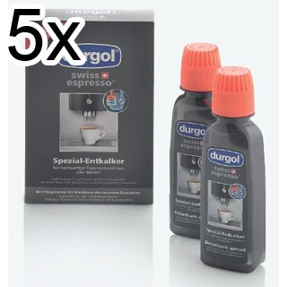 Durgol swiss espresso Spezial -Entkalker für Kaffeevollautomaten, Kaffeemaschinen und Kaffeepadmaschinen. Entkalkt und pflegt hochwertige Geräte aller Marken extrem gründlich und schnell Hochwirksam und einfach anzuwenden. Gebrauchsfertig.Warum sollten Sie entkalken? Kalkbelege können: die Geräte verstopfen zur Überbeanspruchung von Heizelementen führen die Korrosion von Materialien fördern den Energieaufwand erhöhenund dadurch die die Qualität Ihres Kaffees mindern.Deshalb: Entkalken Sie regelmäßig mit durgol swiss espresso und Verlängern Sie die Lebensdauer Ihree Kaffeemaschine!Inhalt: 5 x 2 Portionen à 125ml Spezial-Entkalker